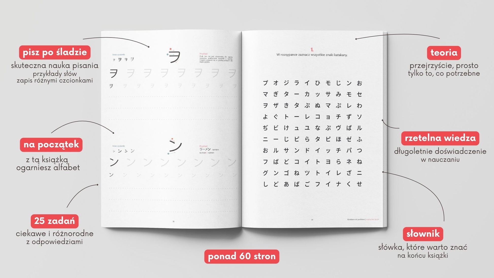 Zeszyt ćwiczeń do katakany to doskonała pozycja dla osoby, która zaczyna naukę japońskiego. Ta pozycja to nie zwykły, nudny podręcznik, a ciekawy, kolorowy zeszyt ćwiczeń z różnymi zadaniami, które pozwalają utrwalić jeden z japońskich sylabariuszy.