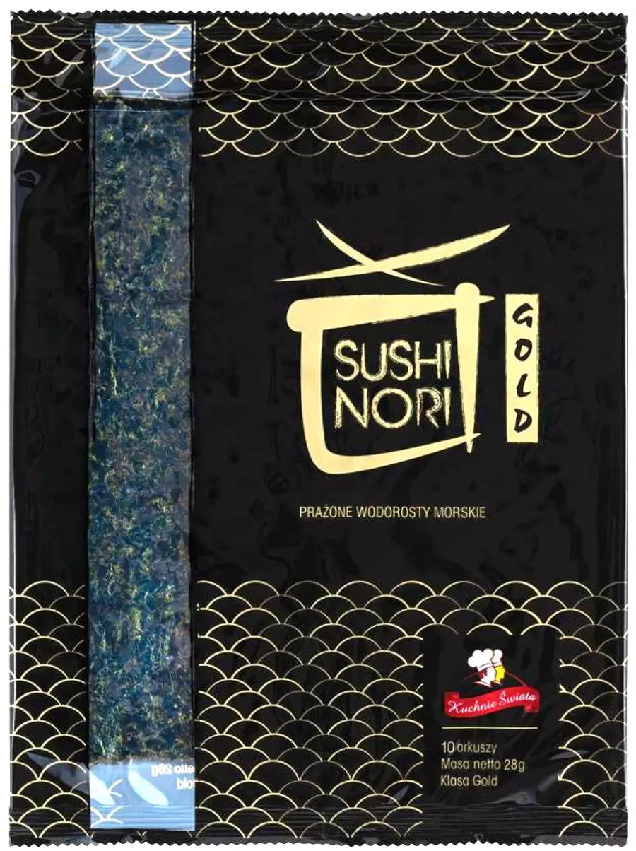 Nori Gold to wyższej klasy glony morskie suszone i prażone dla intensywnej świeżości i chrupkiej struktury. Arkusze cechuje głęboki ciemnozielony kolor, równomierna tekstura i naturalny morskiczny smak – produkowane z ekologicznych hodowli, przy wykorzystaniu tradycyjnych procesów suszenia i prażenia w niskiej temperaturze (ok. 40 °C).