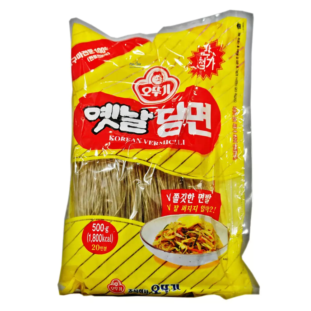 Makaron Dangmyeon Ottogi to tradycyjny koreański makaron szklany produkowany w 100 % z mąki słodkich ziemniaków. Po ugotowaniu staje się przezroczysty i doskonale chłonie smaki sosów i marynat. Wyróżnia się lekką, ale sprężystą konsystencją, co czyni go idealnym składnikiem azjatyckich dań jednogarnkowych, sałatek oraz zup. Jego neutralny smak pozwala na kreatywność w kuchni, od klasycznego japchae po zupy i stir‑fry.