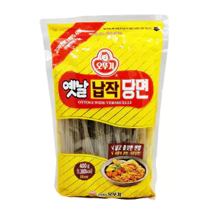 Makaron dangmyeon Ottogi wstążki to plaski, szeroki makaron szklany wykonany z mąki batatowej, który po ugotowaniu staje się przezroczysty i miękki, a jednocześnie zachowuje swoją sprężystość. Dzięki swojej zdolności do absorpcji smaków świetnie współgra z bogatymi sosami i bulionami, a jednocześnie dostarcza autentycznego, koreańskiego charakteru daniom typu japchae oraz potrawkom mięsnym i warzywnym.